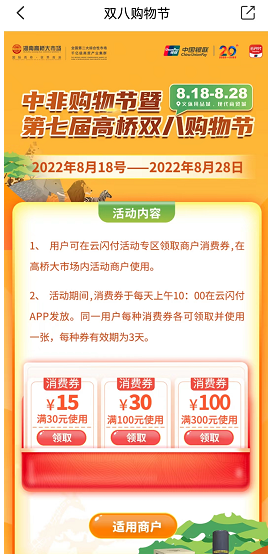由雨花区商务局指导,高桥大市场携手银联云闪付推出的中非购物节暨第七届高桥双八购物节钜惠开启,发放20万元消费券。
