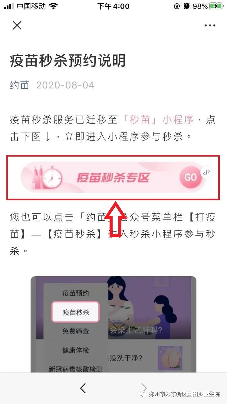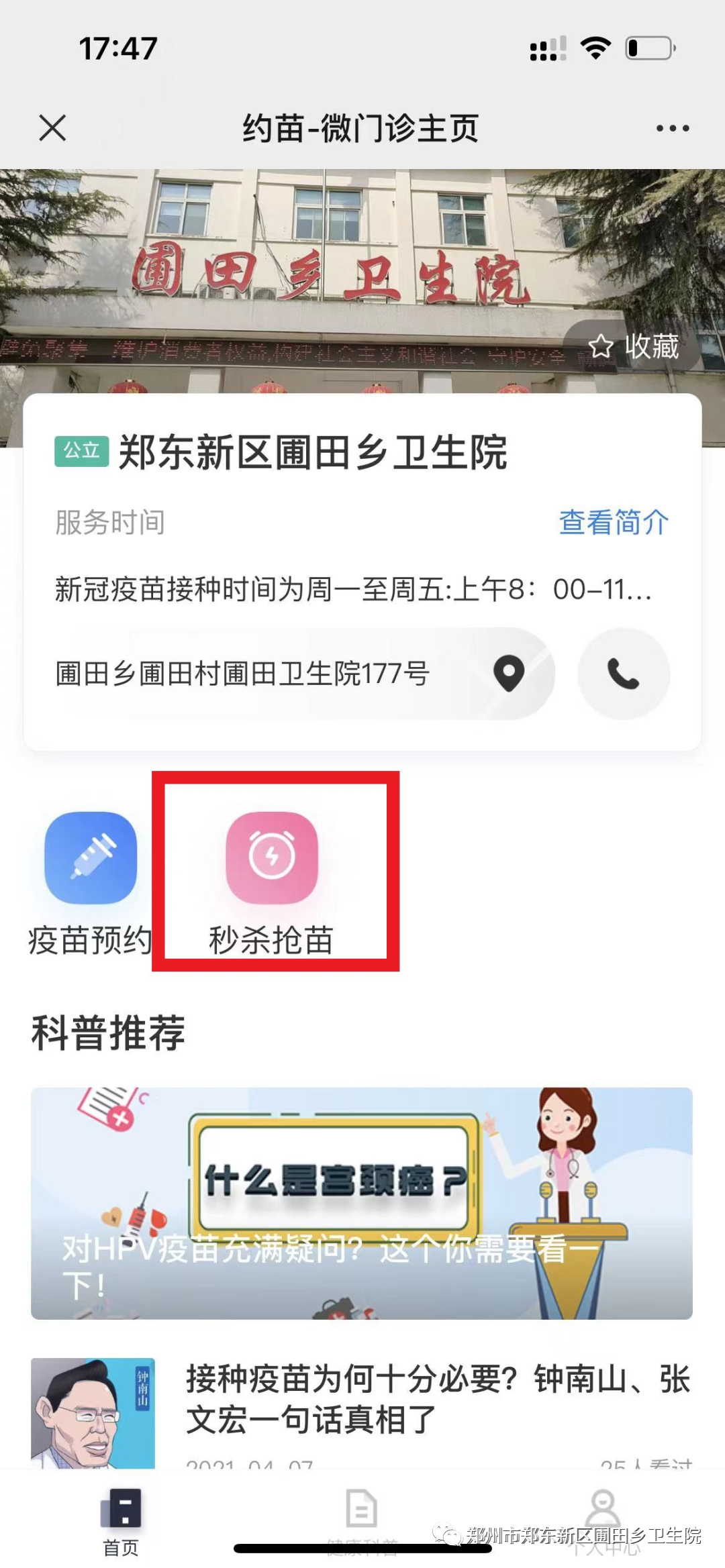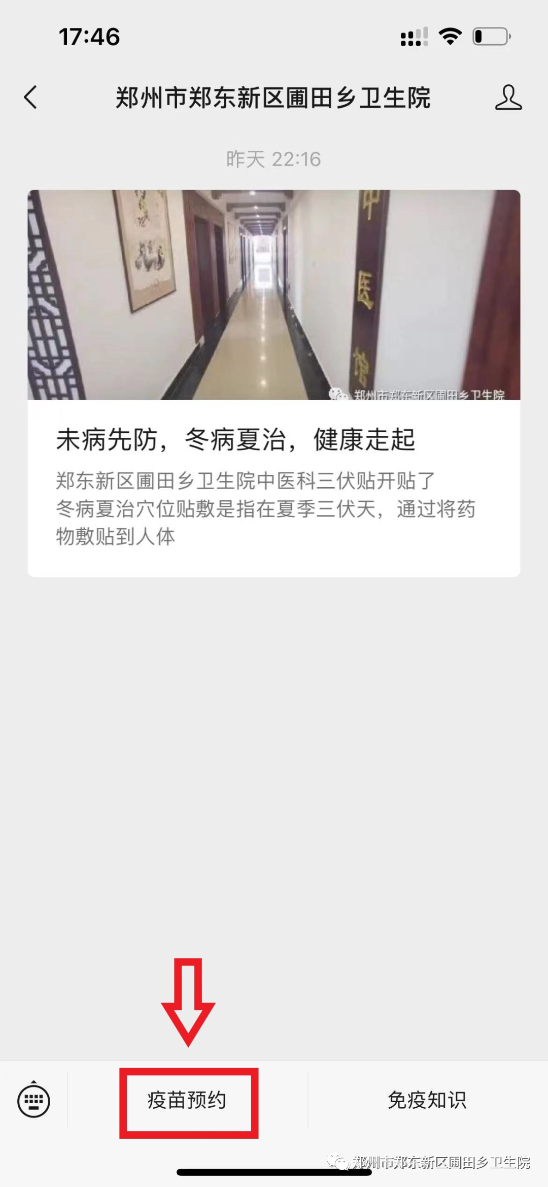 1、关注“郑东新区圃田乡卫生院”微信公众号