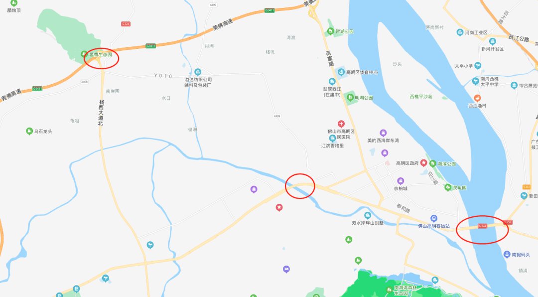 高明区:高明大道高明大桥段、沧江跨线桥至三洲大桥路段,广明高速沧江出口盈香转盘路段,省道S113(合和大道)与广台高速更合西出入口交叉口。