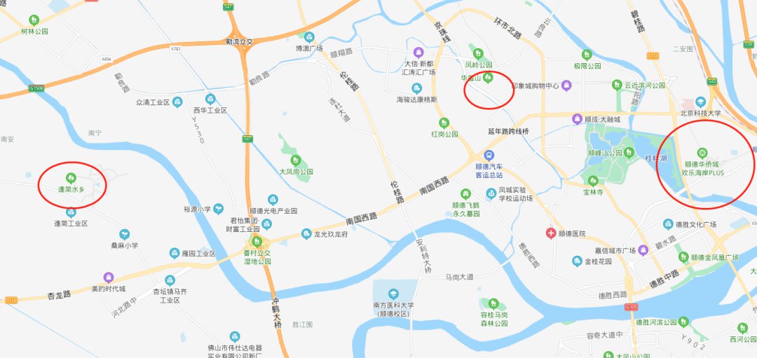 顺德区:大良清晖园(清晖路、凤山路)、逢简水乡、华侨城欢乐海岸(碧桂路辅道、欢乐大道、龙盘路东延线)。