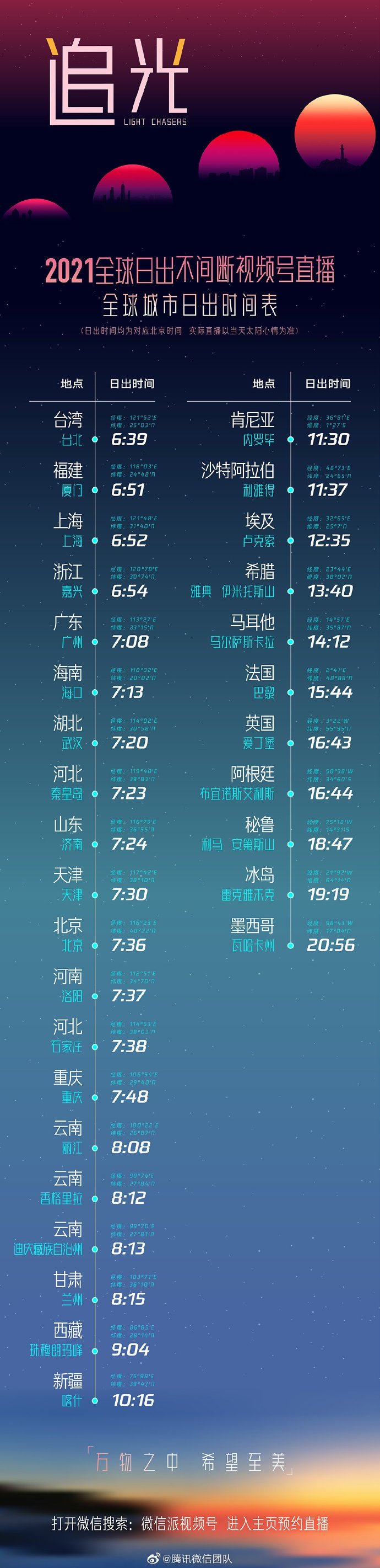 2021全球日出不间断视频号直播『全球城市日出时间表』。