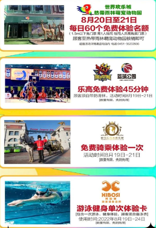 8.20-8.28至哈尔滨世界欢乐城客服中心领取畅享欢乐卡,每人限领一份,数量有限,送完为止