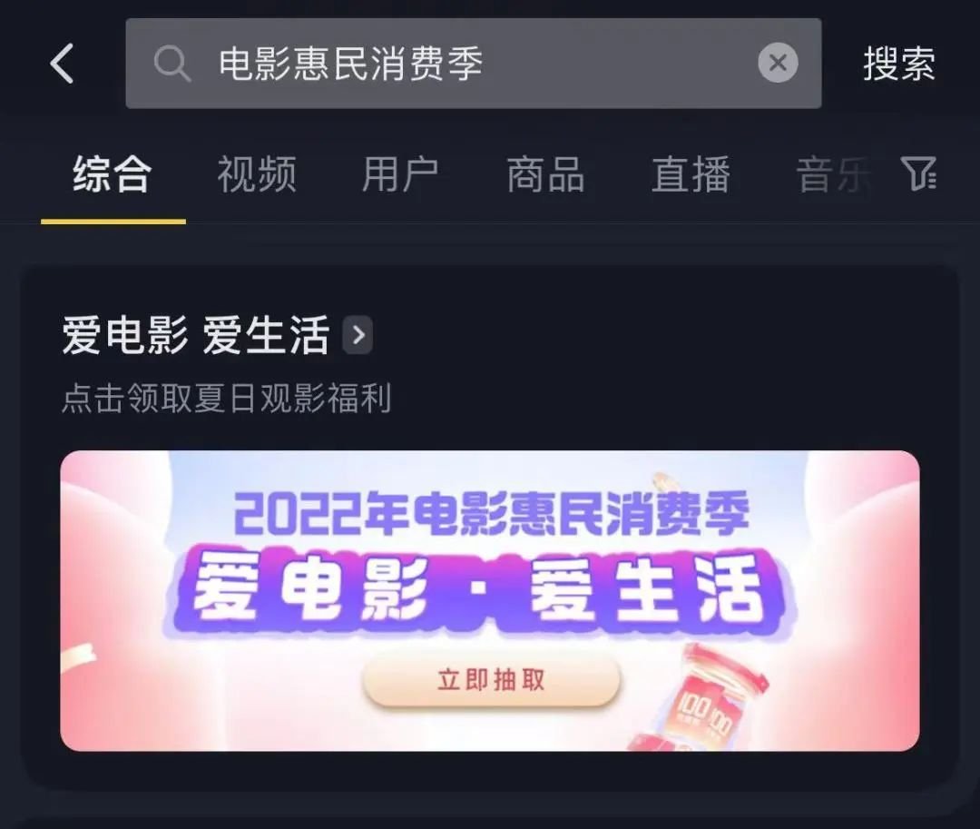 打开抖音搜索“电影惠民消费季”,点击“爱电影·爱生活”专区专栏。