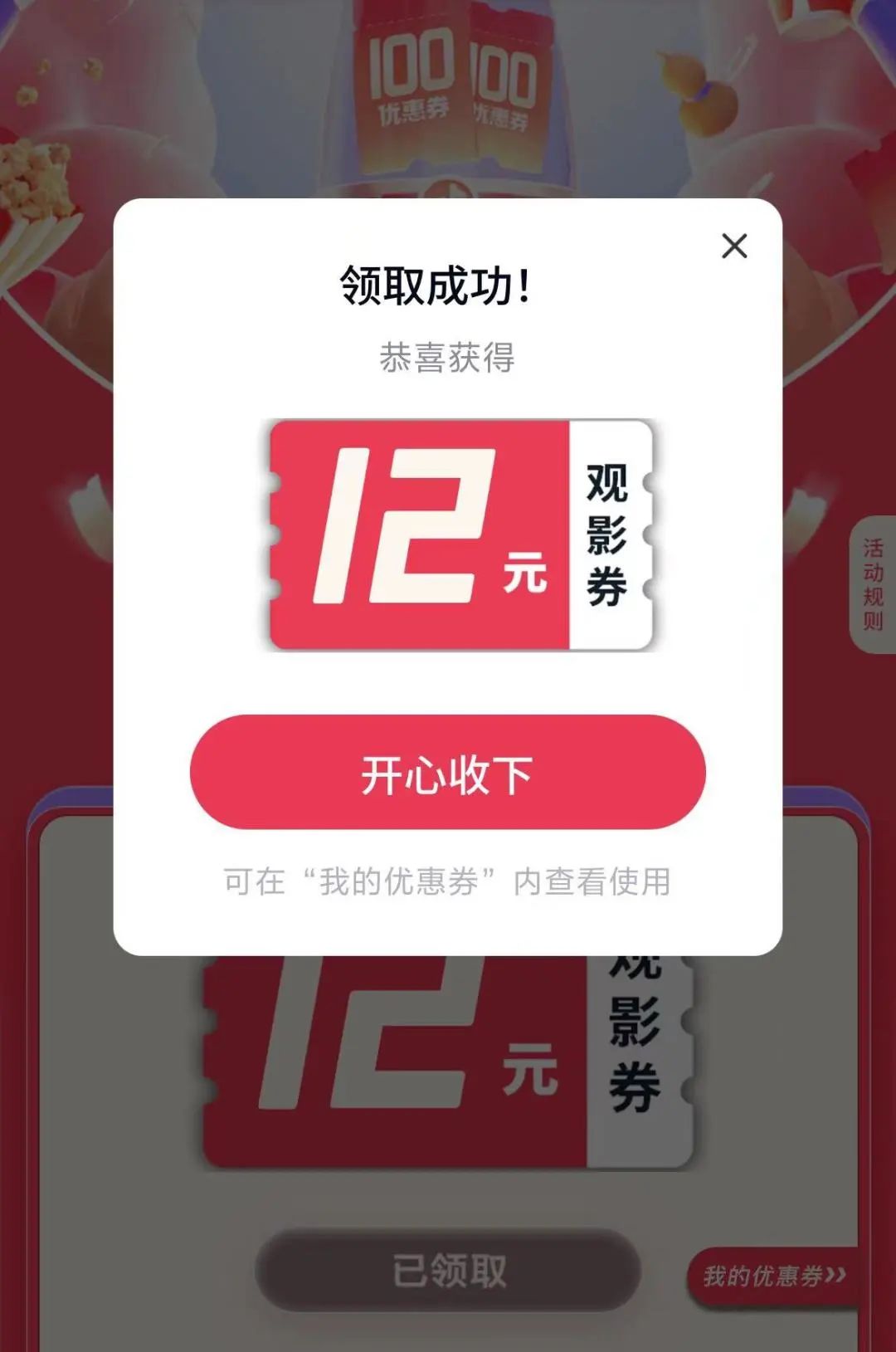 点击“立即领取”并收下12元观影券。