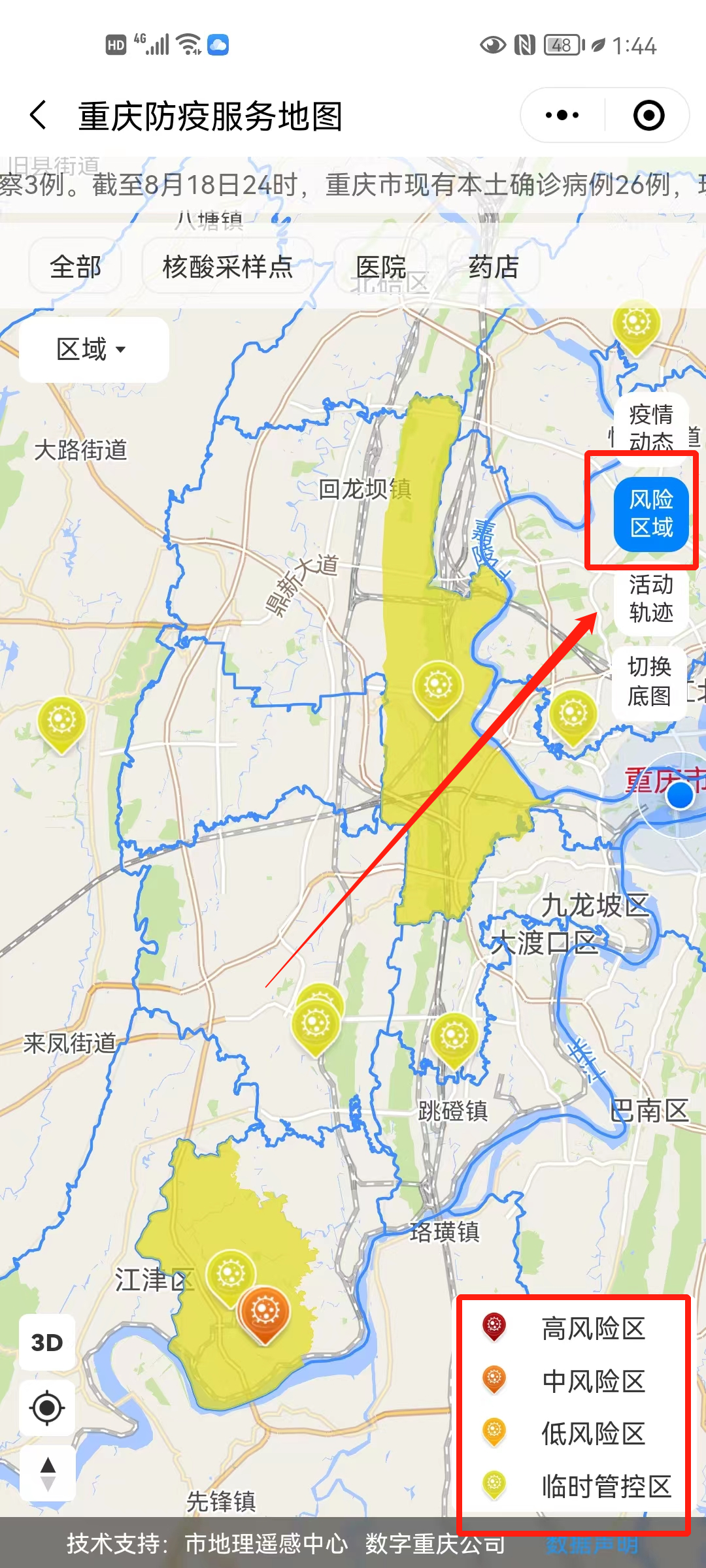 二、选择“风险区域”即可查询【临时管控区】和【风险区】