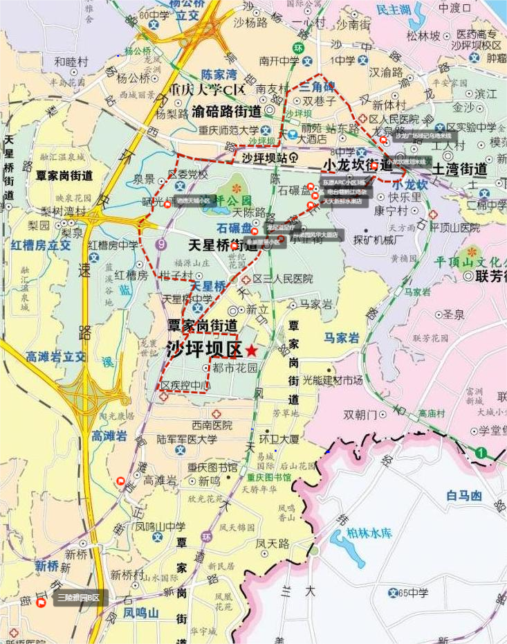 覃家岗街道、渝碚路街道、沙坪坝街道、小龙坎街道、天星桥街道、土湾街道、新桥街道、双碑街道、石井坡街道、童家桥街道、磁器口街道、山洞街道、井口街道、联芳街道、歌乐山街道、中梁镇等16个镇街(见附图1)。