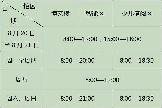 8月20日至8月21日,中午我馆将闭馆消杀。后续至8月31日,执行上图暑假开放时间。9月1日起,少儿借阅区恢复日常开放时间,即周一至周四:12:00-18:30。