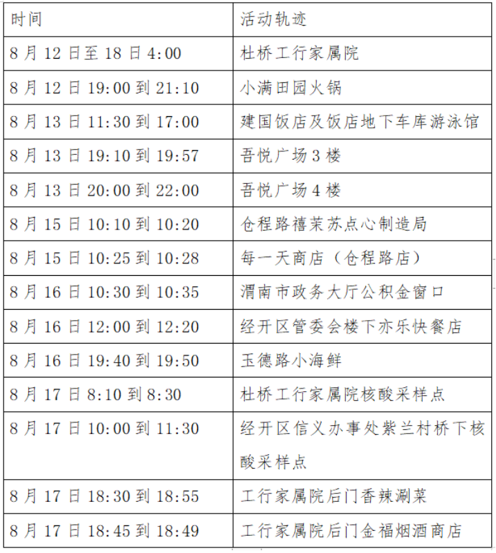 8月17日,渭南经开区新增2例无症状感染者。为提醒广大居民做好个人防护,经流行病学调查,现将其活动轨迹公布如下: