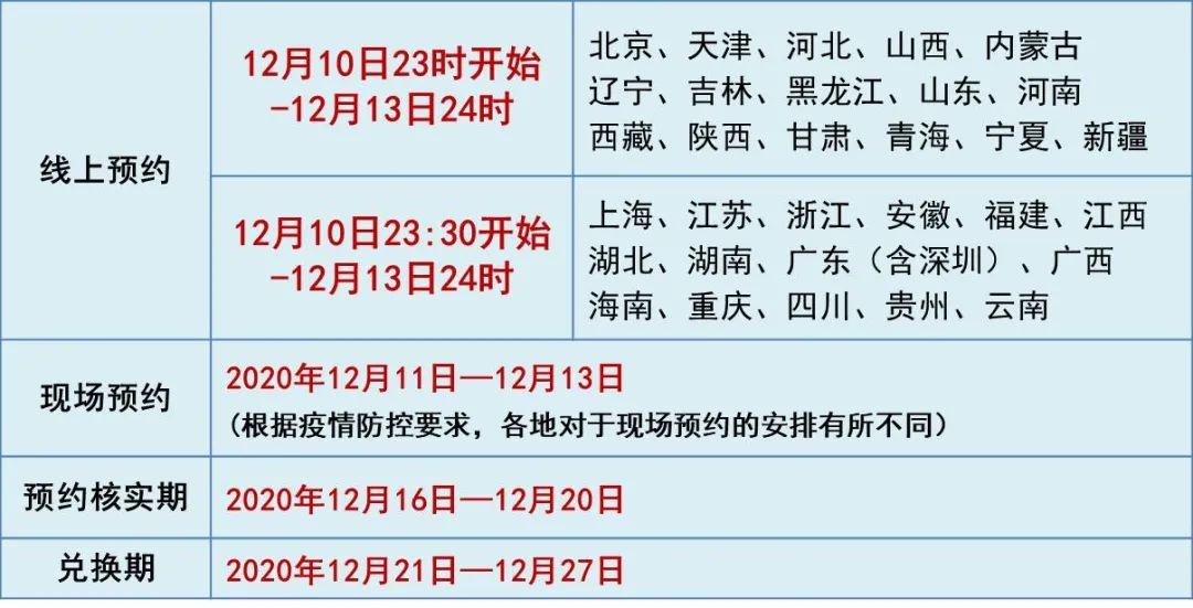 ①北京、天津、河北、山西、内蒙古、辽宁、吉林、黑龙江、山东、河南、西藏、陕西、甘肃、青海、宁夏、新疆等地区于2020年12月10日23时启动预约;