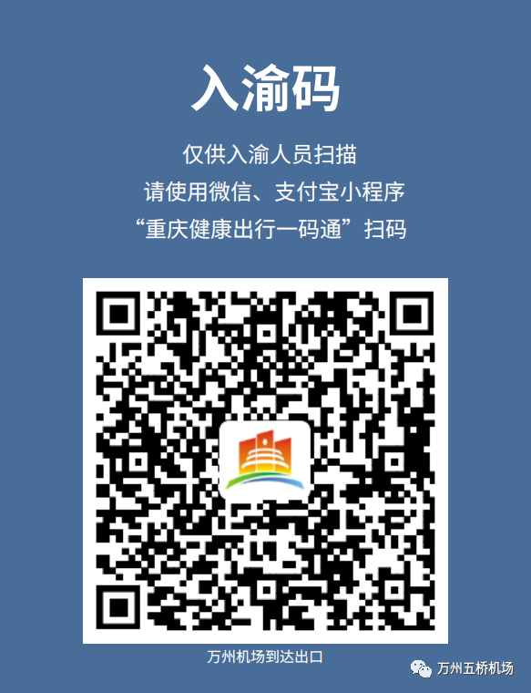 入渝码是专门针对机场、火车站、省际长途汽车站、高速公路下道口等交通口岸(以下统称交通口岸)生成的一种特殊场所码;标识了交通口岸的位置、名称等信息,布置在各交通口岸的醒目位置。