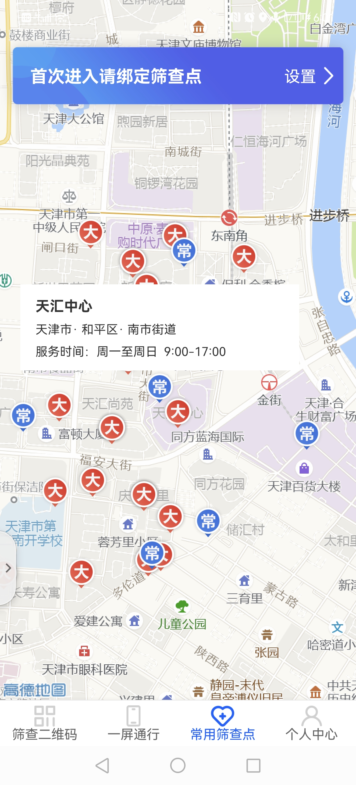 3、进入后,地图直接显示周围筛查点,点击地图中的“常”图标,即可查看常态化核酸检测点名称,所属地区街道,服务时间。点击“大”图标,即可查看核酸大筛点名称,所属地区街道,服务时间。