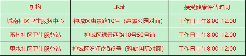三、60-64岁非高血压或糖尿病人群,请携带身份证件于工作日时间上午8:00-12:00到城南社区中心、番村社区站、里水社区站,经家庭医生健康评估后,领取预约凭证。