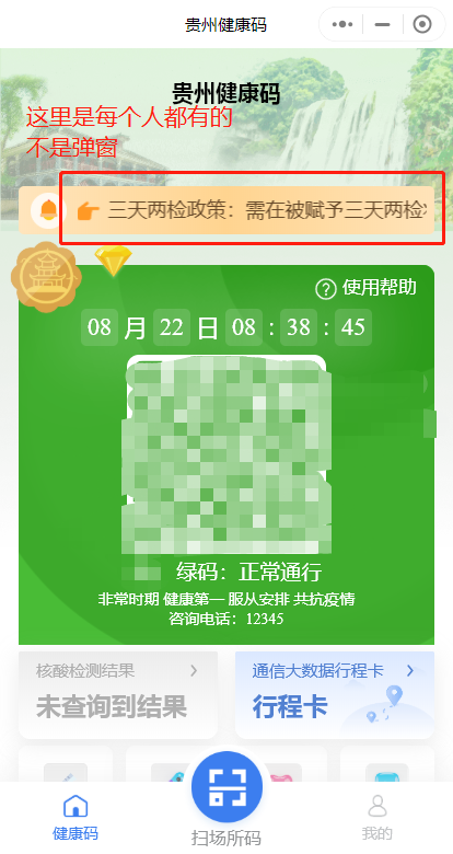 贵州健康码上方的黄色滚动条(如下图)是每个人的贵州健康码页面都有的,是三天两检政策提示,不是弹窗!看见这个黄色滚动条不用着急心慌哦~