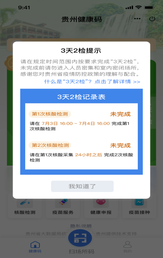 出现“需3天2检”标识人员,若未按规定在第1天完成第1次核酸采样或超过3天未完成第2次采样时,“贵州健康码”将会出现弹窗提示,待按要求完成相应次数的核酸采样后,弹窗提示会关闭。