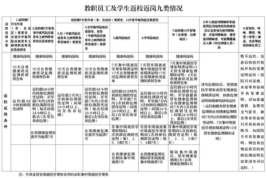 新学期将至,当前国内多省市发生聚集性疫情,我市及周边区县市相继出现输入性确诊病例,因暑假期间师生员工流动剧增,疫情输入风险极大,为确保系统广大师生员工及家长的身体健康和生命安全,确保系统开学平稳,根据《新型冠状病毒肺炎防控方案(第九版)》《高等学校、中小学校和托幼机构新冠肺炎疫情防控技术方案(第五版)》等文件要求,现将我市2022年秋季开学疫情防控相关要求告知如下,请全体师生员工和家长遵照执行。