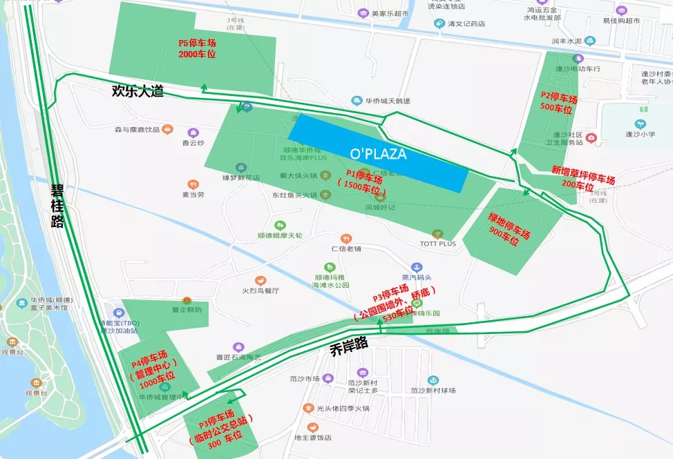 碧桂路和乔岸路交叉处的华侨城管理中心也是可以停车的,沿乔岸路直走掉头就能看到车场入口。靠近机动游戏所在的欢乐时光主题公园。
