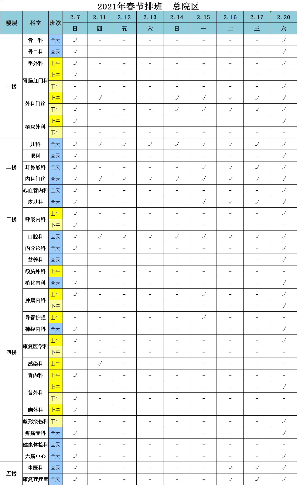 2021年春节期间,文明门诊从2021年2月11日至17日暂停夜间急诊(白天和中午照常安排值班医生),夜间需要就诊的患者,请移步总院区急诊科;