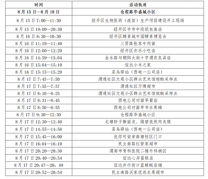 8月19日渭南临渭区新增2例本土确诊病例和1例无症状感染者活动轨迹