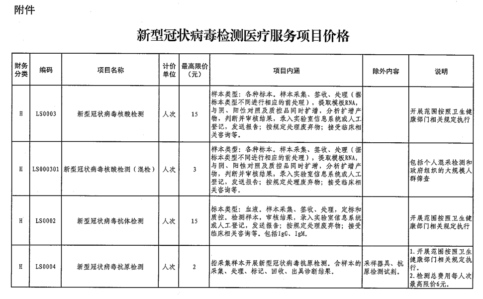 公立医疗机构开展的新冠病毒核酸检测单人单检价格(含检测试剂)每人次最高限价为15元;多人混检不分样本数量,每人次最高限价为3元(含检测试剂)。