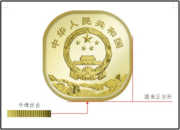 硬币外形为由四段圆弧和四段线段交替连接组成的圆角正方形。