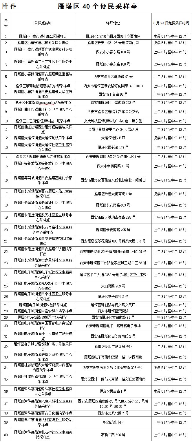 (二)届时,雁塔区40个便民采样亭(见附件)也将免费向广大市民服务,来雁塔旅游的游客可就近选择完成核酸采样。