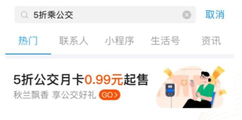 方法②:在支付宝首页搜索框输入“5折乘公交”、“5折公交月卡”,直达“5折公交月卡0.99元起售”活动页面。