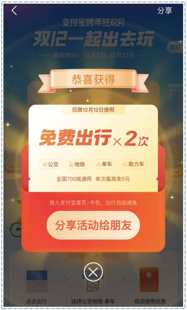 12月7日-12月12日,上支付宝搜索【免费出行】,进入活动页即可领取一份乘车优惠资格。