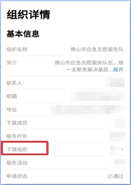 ② 早前已成功注册的志愿者,在完善了个人资料后,可以通过界面进入“个人中心”→“归属组织”搜索并选择“佛山市应急志愿服务队”,找到“下属组织”进入并根据自身所在属地,选择佛山市应急志愿服务XXX区支队。