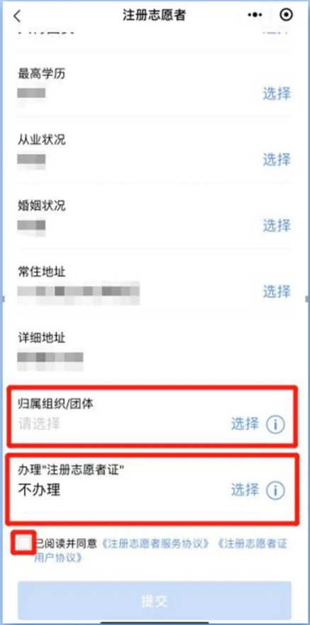 如长期居住在三水的市民,可以在“归属组织/团体”栏搜索并选择佛山市应急志愿服务三水区支队”,自由选择是否办理志愿者证,最后确定并提交个人资料。