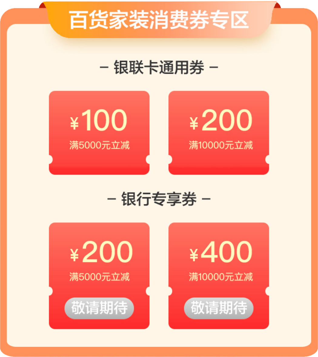 活动期间,用户登录“云闪付APP”-“青岛消费券”-“百货家装消费券专区”活动页面专区,领取百货家装消费券。消费券分满5000元减100元、满10000元减200元两种。