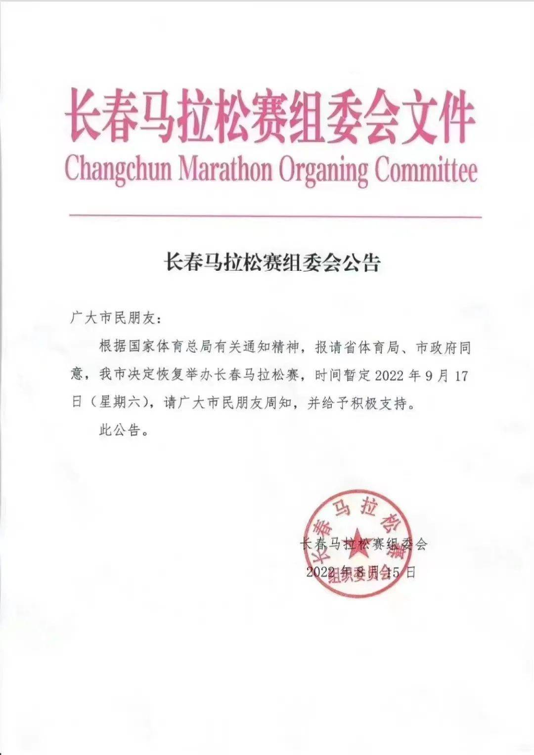 预计2022年8月24日10:00至8月31日18:00,报名人数超出限制将抽签决定参赛人员,具体以组委会后续发布为准【其中获得2021长春马拉松参赛资格选手自动获得原项目参赛资格(5公里、10公里合并为7.5公里健康跑)】