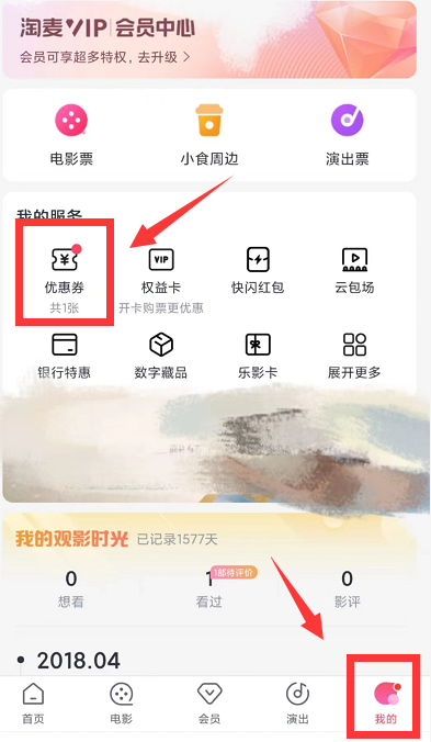 第三步:接下来点击【我的】,在页面中找到【优惠券】即可查看领取到的优惠券,再点击【去使用】即可