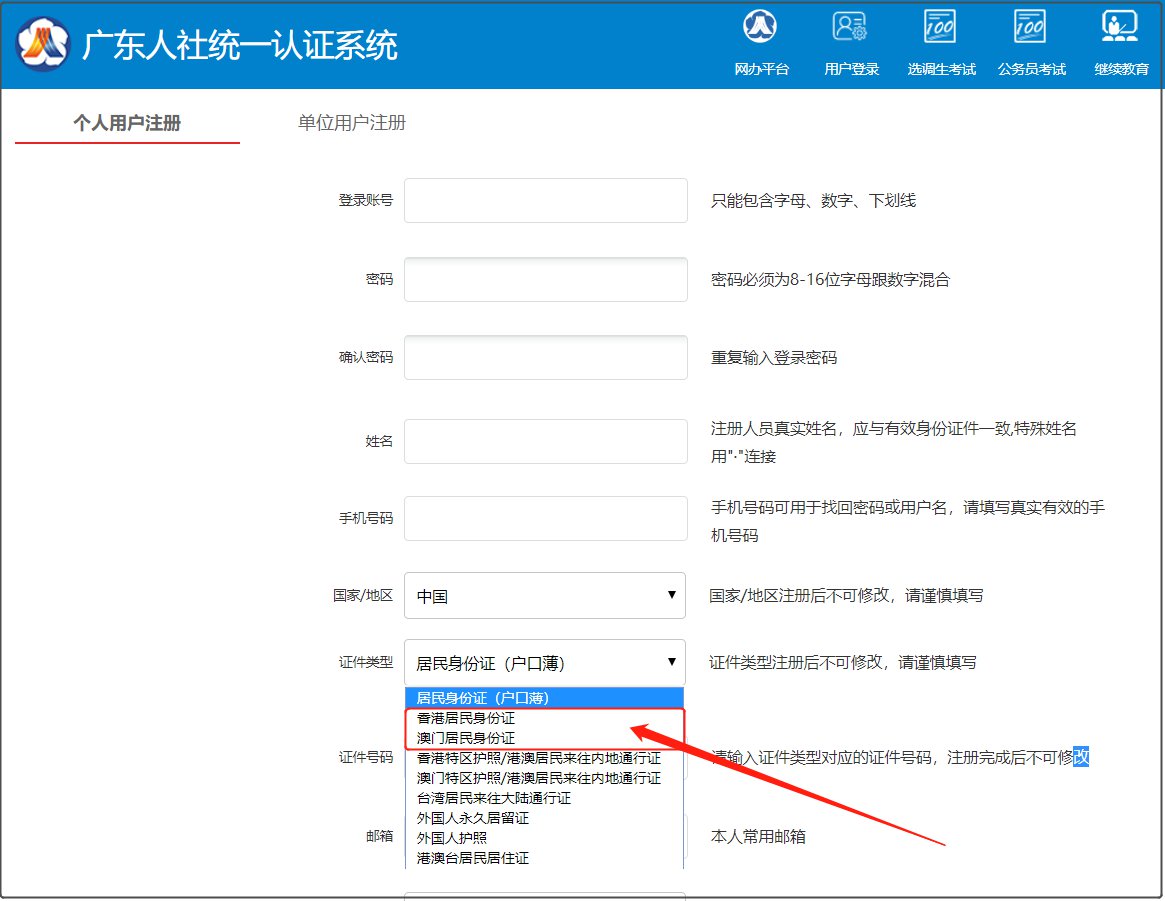 港澳居民中的中国公民在报名注册时,请在证件类型中选择“香港居民身份证”或“澳门居民身份证”,并填写身份证号进行注册。