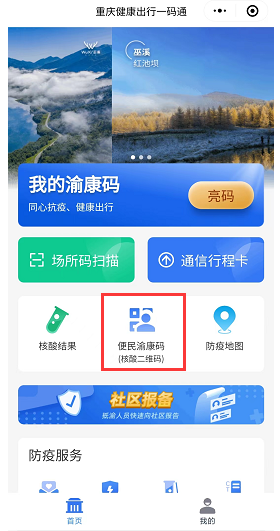 大家打开渝康码小程序,打开后,点击"便民渝康码"