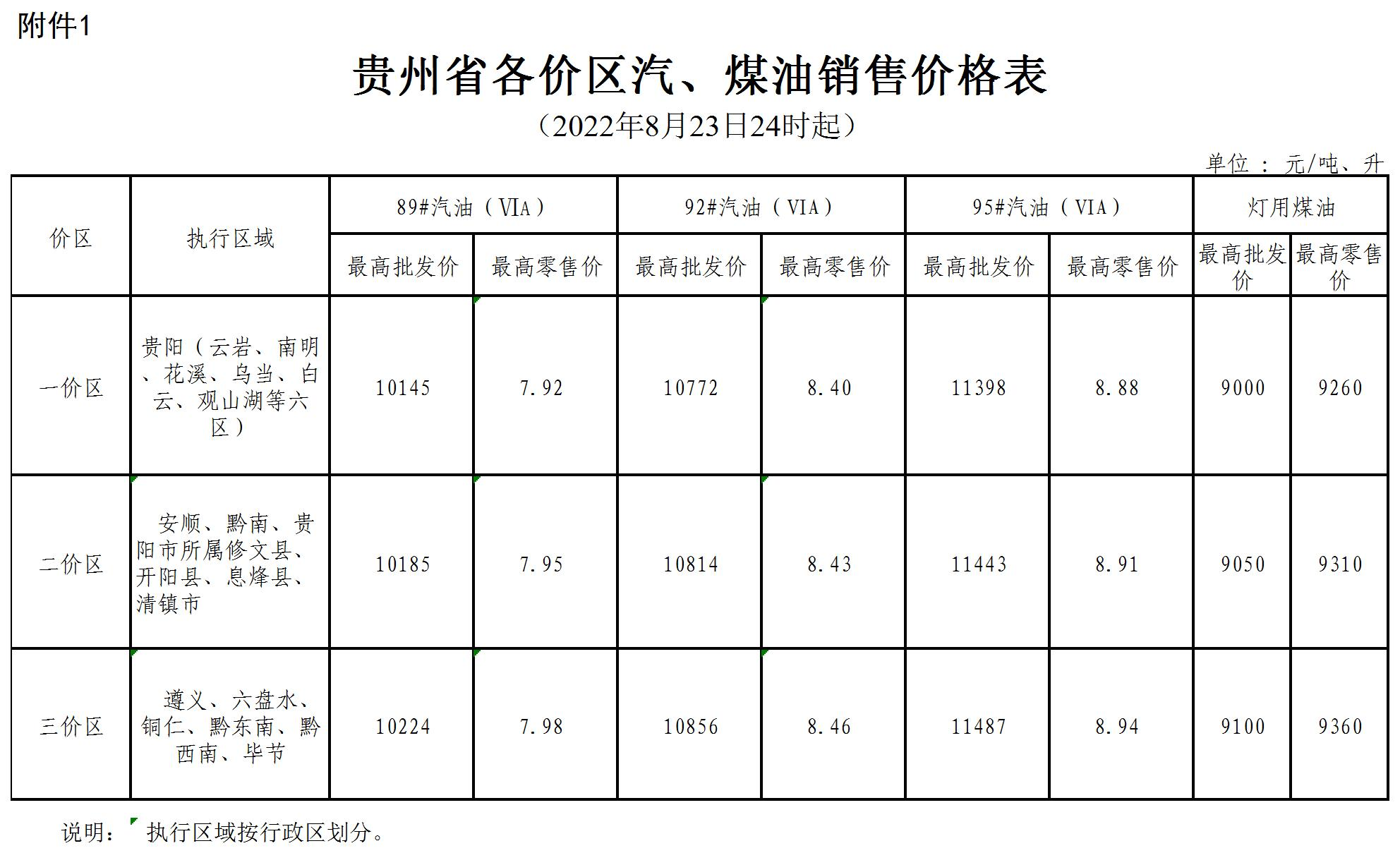 二、贵州省各价区汽、煤油销售价格表