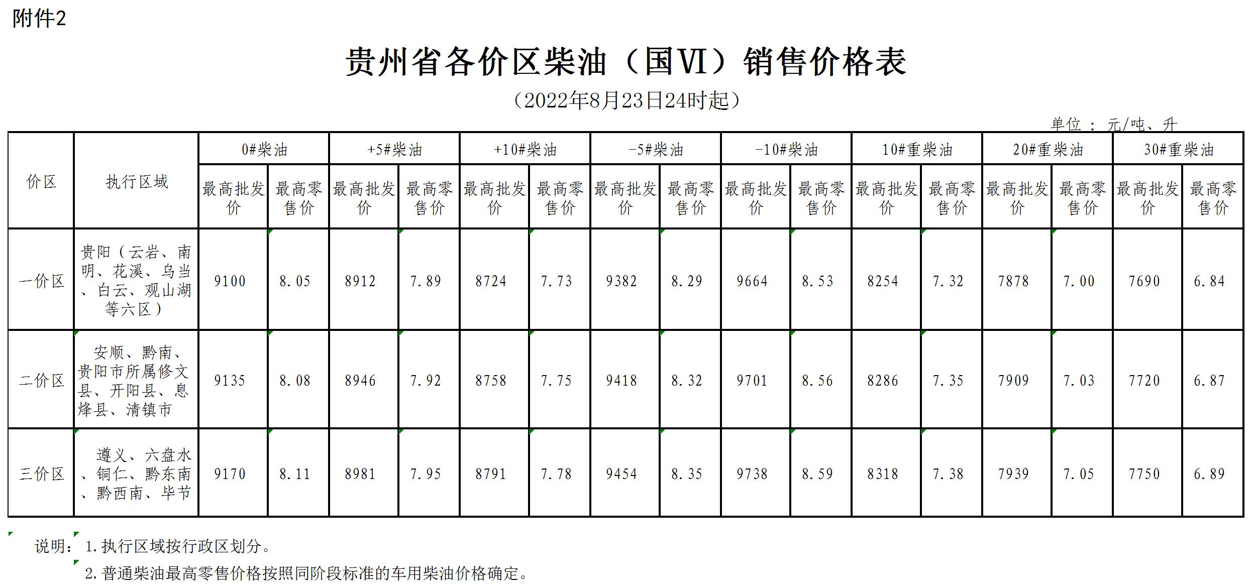 三、贵州省各价区柴油(国VI)销售价格表