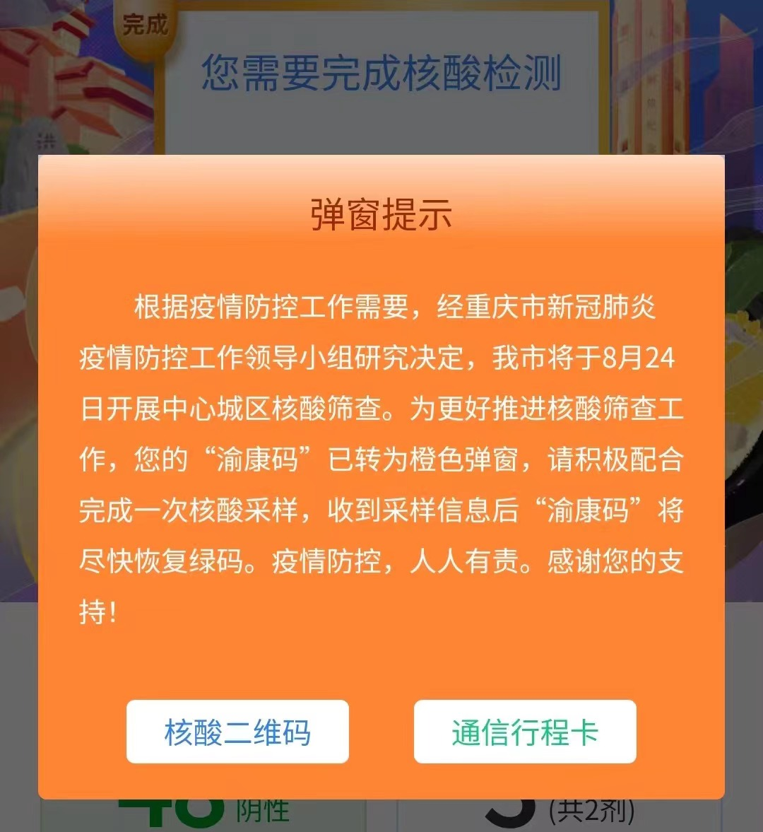 重庆渝康码橙色弹窗是什么样子的 渝康码显示红色