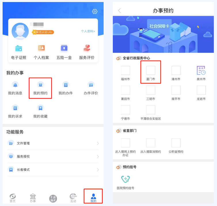 3.登录“闽政通”APP,点击首页右下方“我的”—>“我的预约”—>“去预约”,选择“厦门市”进行预约。