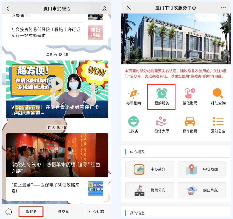 1.关注“厦门审批服务”微信公众号,点击首页下方“微政务”,选择“预约服务”进行预约。