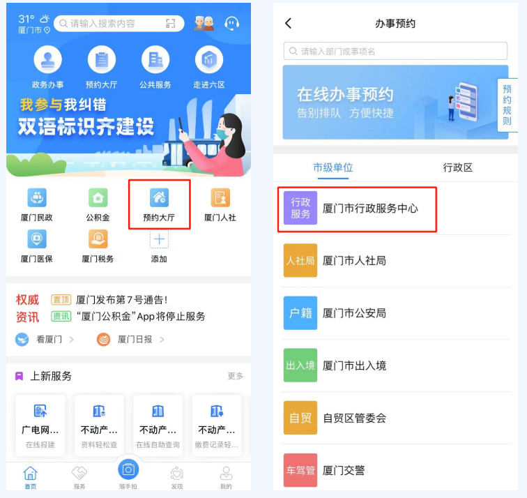 2.登录“i厦门”APP,点击首页中的“预约大厅”,选择“厦门市行政服务中心”进行预约。