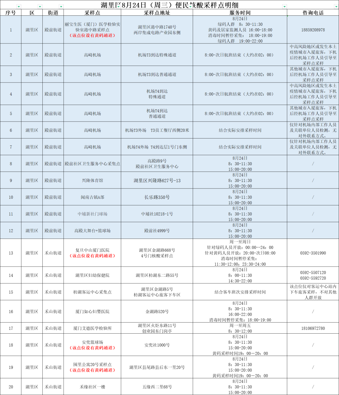 8月24日,思明区的最新核酸检测采样点汇总表,请市民朋友根据通告要求,自行前往,提前做好采样信息预登记。