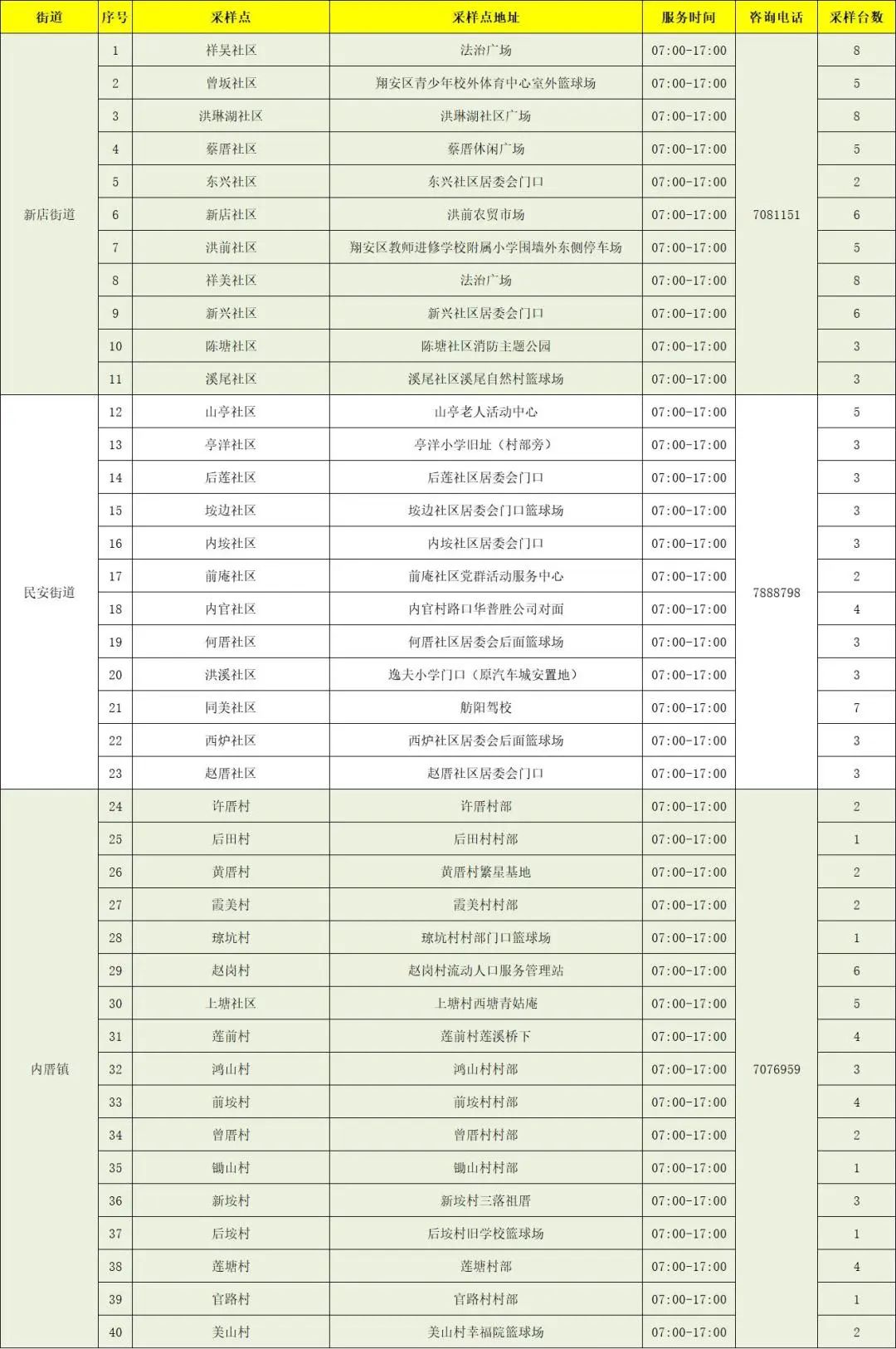 我区于新店街道、民安街道、内厝镇集中开展核酸检测,以上镇街居民,可前往社区核酸采样点进行检测。