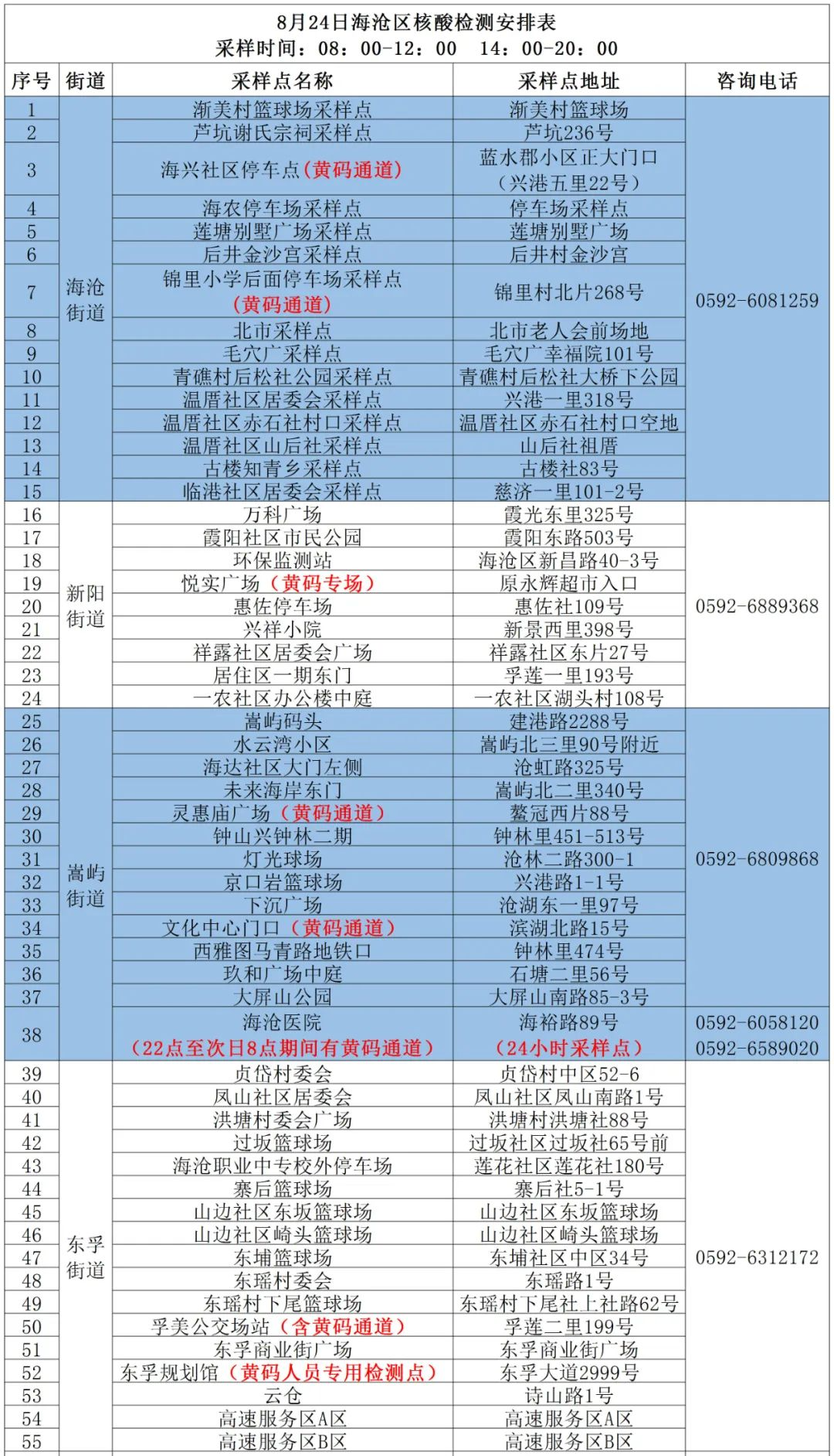 采样地点:8月24日,海沧区安排55个便民核酸检测采样点,海沧医院设有24小时核酸检测采样点。