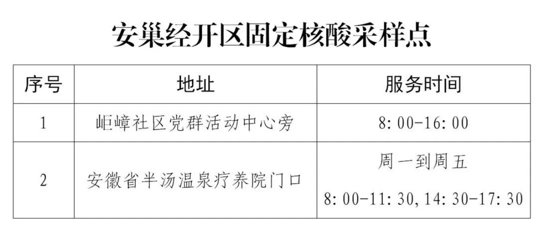按照合肥市疫情防控应急指挥部统一部署,经安巢经开区疫情防控指挥部研究决定,8月25日(周四)5:30-10:30在全区范围内开展新一轮免费核酸检测。