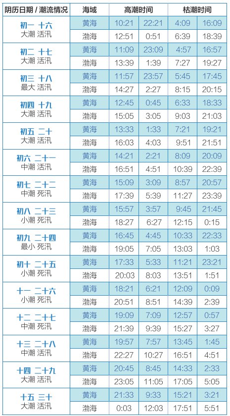 6、潮汐循环周期为15天,因此,初一和十六潮汐时间相同,以此类推。