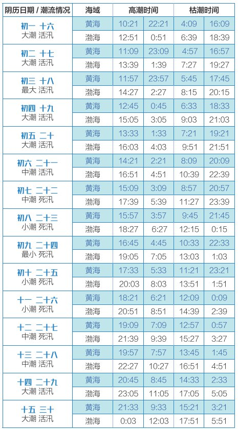 渤海湾的潮汐是初一、十五"两头潮",每月农历初一、十五前后是潮汐落差最大的时候,这才是赶海的最佳时间。