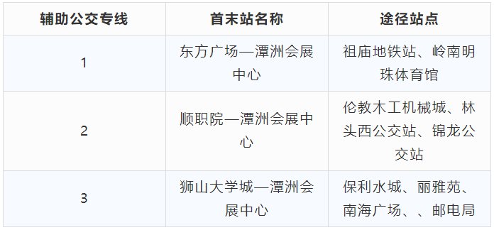 增设潭洲会展中心分别至禅城东方广场、顺德职院、南海狮山大学城共3条辅助公交公交路线,线上售票。