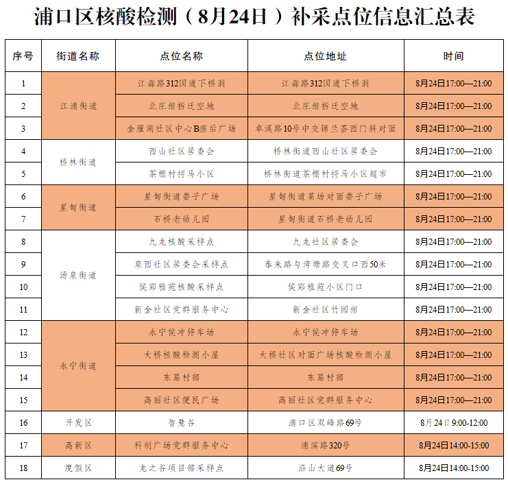 8月24日南京市浦口区核酸检测补检通告+采样点位