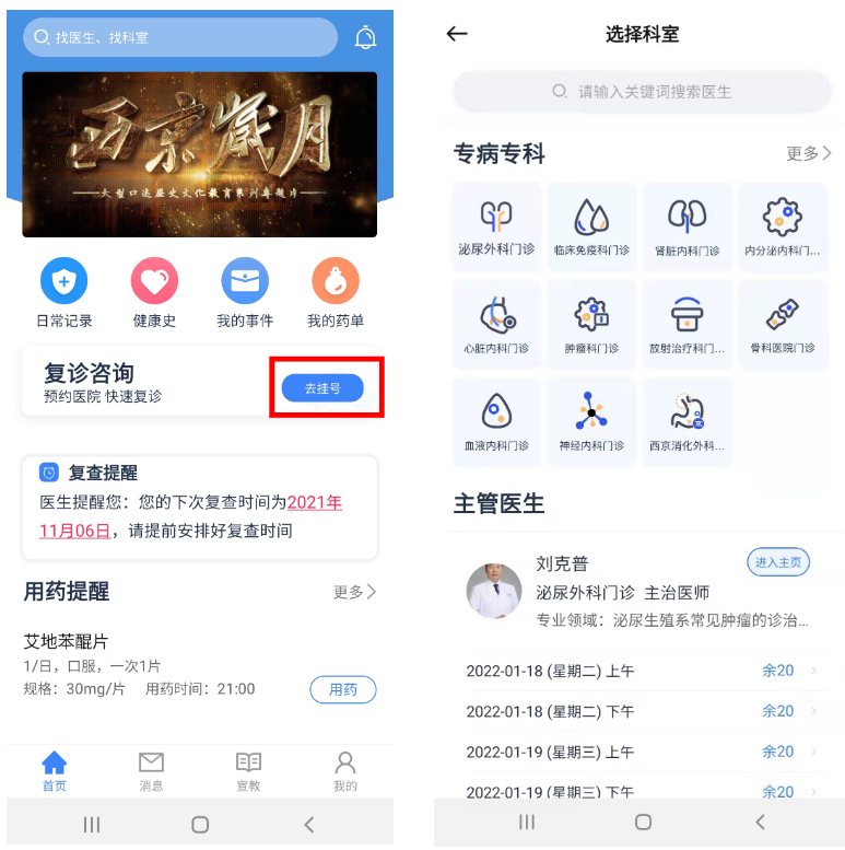 第二步:搜索想要挂号的医生并添加医生;或选择科室挂号