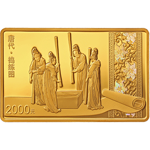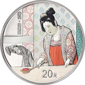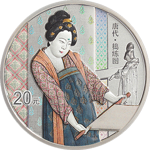 60克圆形银质纪念币背面图案为《捣练图》中缝纫、煽火造型,衬以装饰纹样组合设计,并刊“唐代·捣练图”字样及面额。